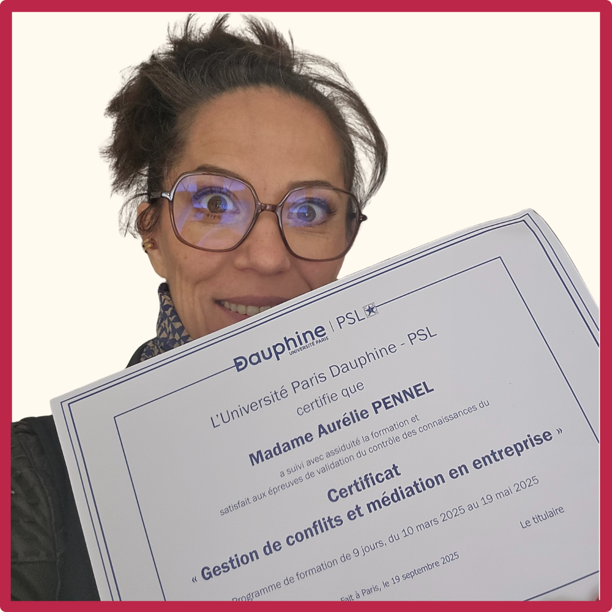 C'est cette prise de conscience qui m'a menée à me former à la médiation en entreprise, et à obtenir mon titre RNCP de médiatrice.